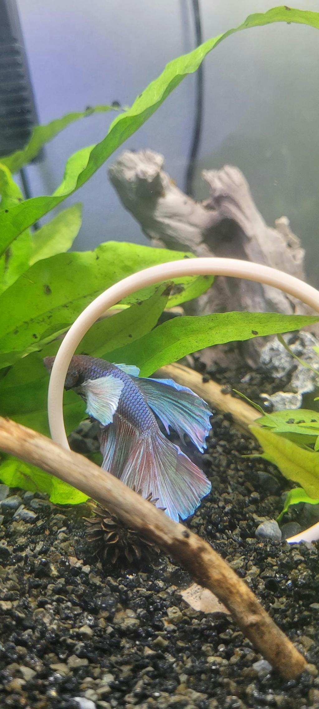 My betta loves to swim through her lime green hoop!